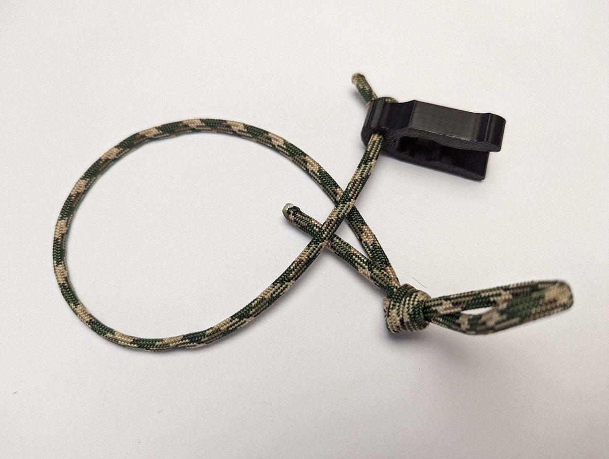 Tether rope clip for saddle hunting. This clip will help hold tether rope from moving and causing slack. Please choose the size you need. Included is 2 feet of camo paracord to make into loops or attach to tether.