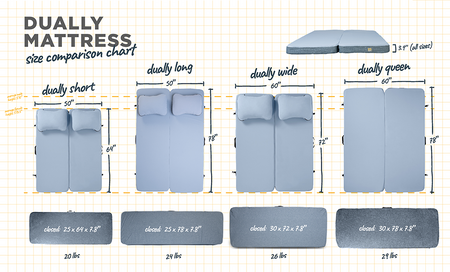 Dually Long 78"x50", Dually Wide 60"x72", Dually Short 50"x64" & Dually Queen 78"x60". Enhanced Memory Foam sleeps two comfortably with room for an adventure dog to join! The comforts of your home mattress in a portable, durable, camping trip-ready form. The Multi-Layer design provides optimal body alignment, pressure point relief, temperature control, and durable protection from the great outdoors.