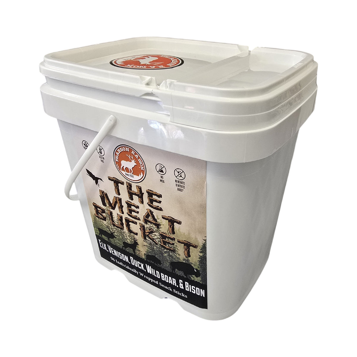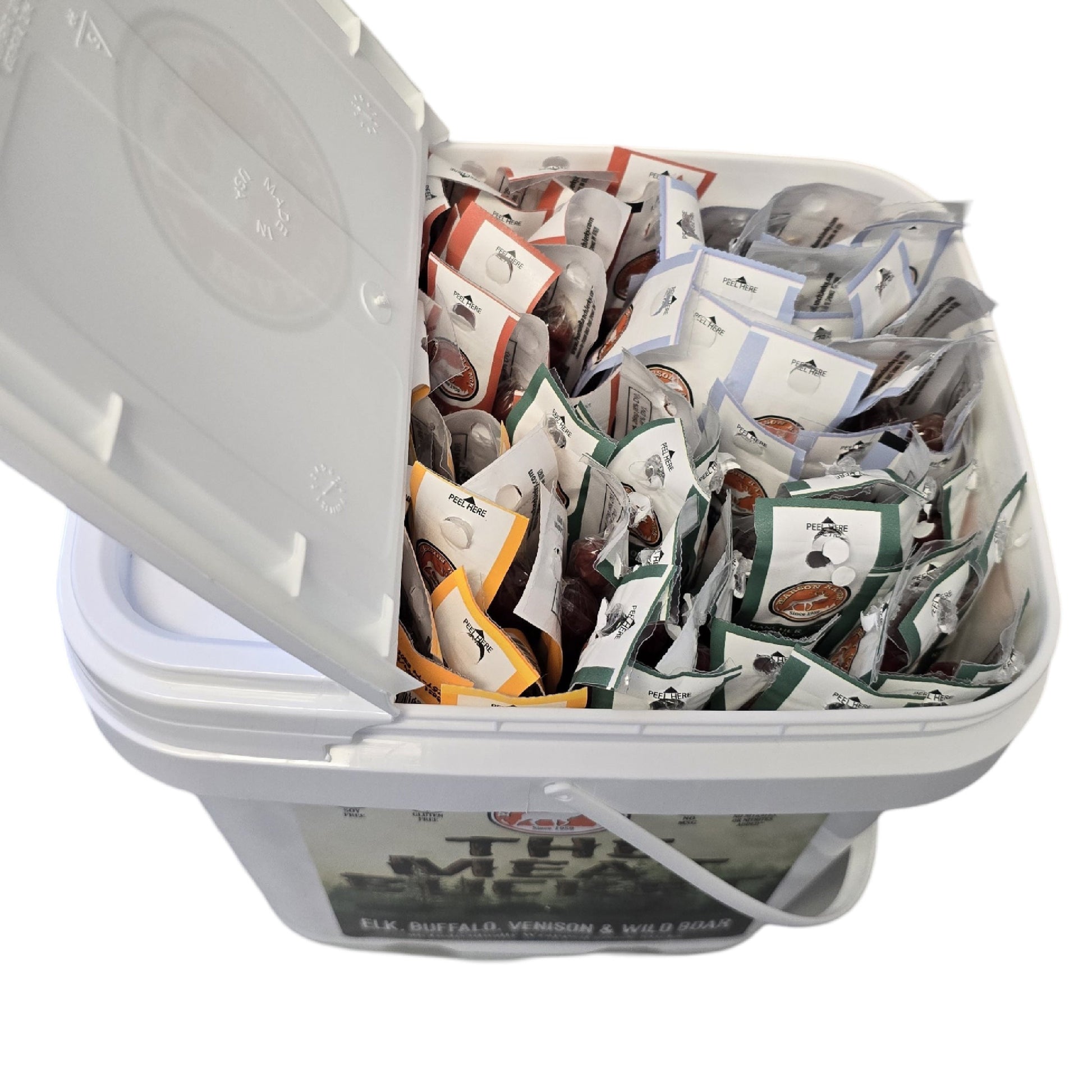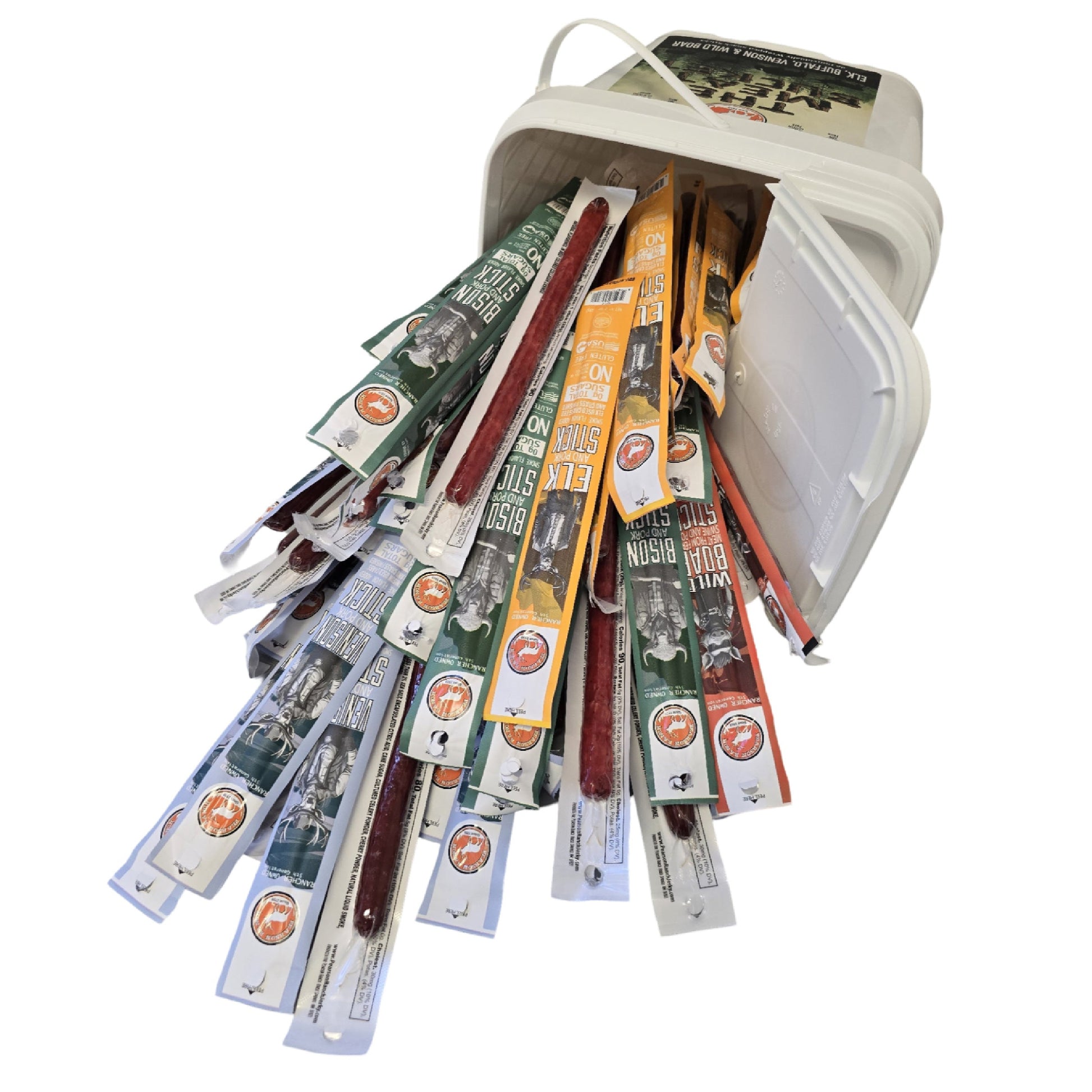 A handled 2 gallon bucket filled with 96 individually-wrapped snack sticks ready to go. You get twenty-four each of our famously delicious elk, bison, and venison, and twelve each wild boar and duck snack sticks.