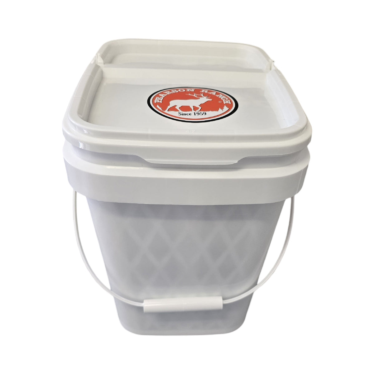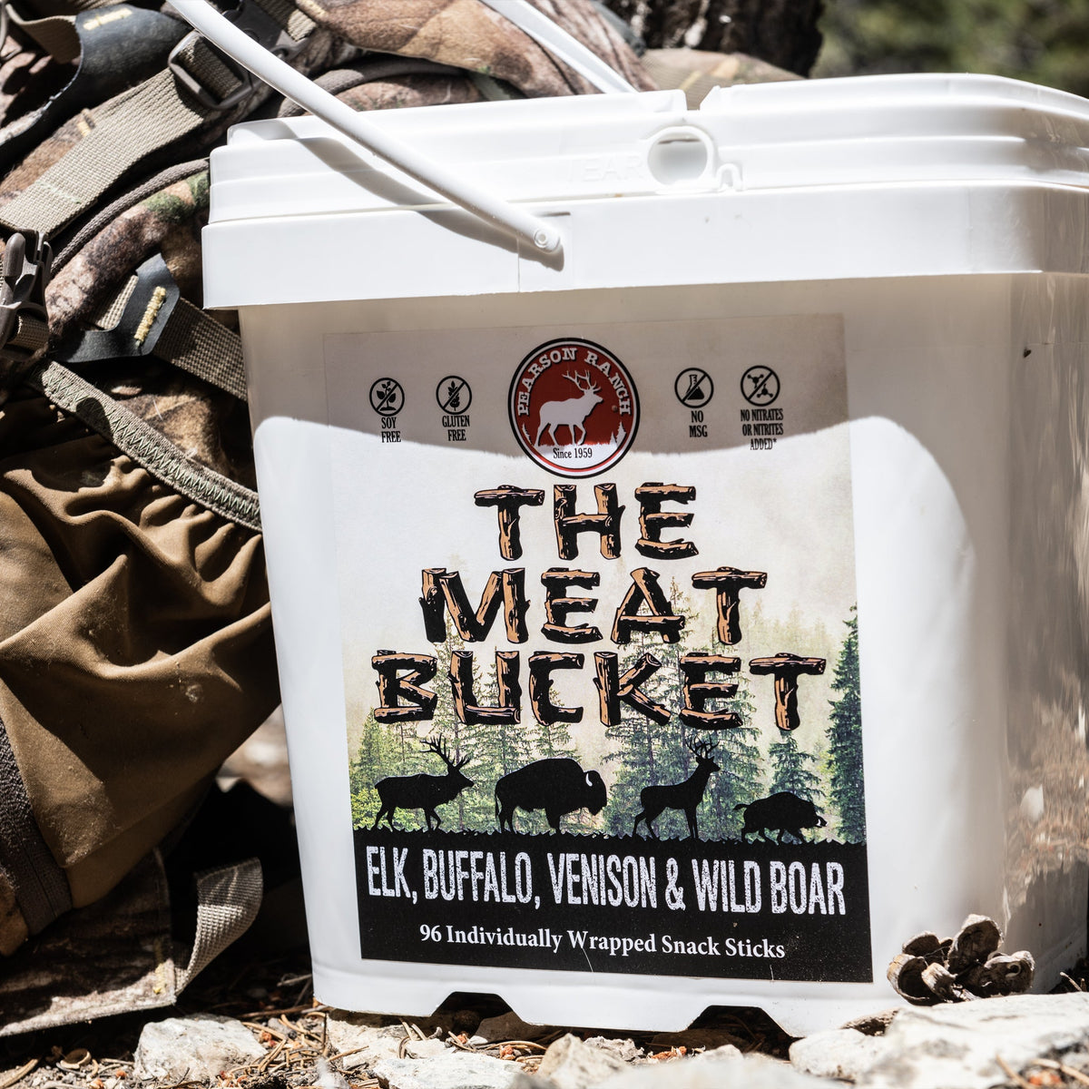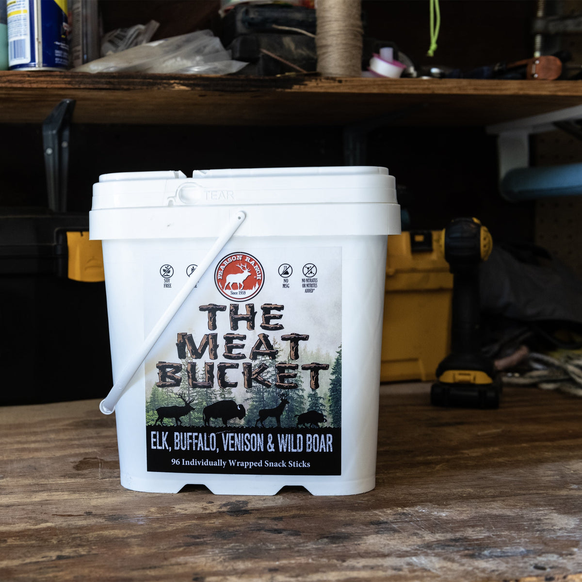 A handled 2 gallon bucket filled with 96 individually-wrapped snack sticks ready to go. You get twenty-four each of our famously delicious elk, bison, and venison, and twelve each wild boar and duck snack sticks.