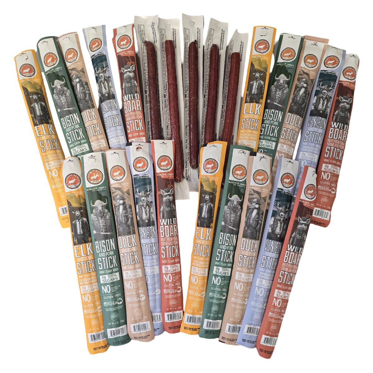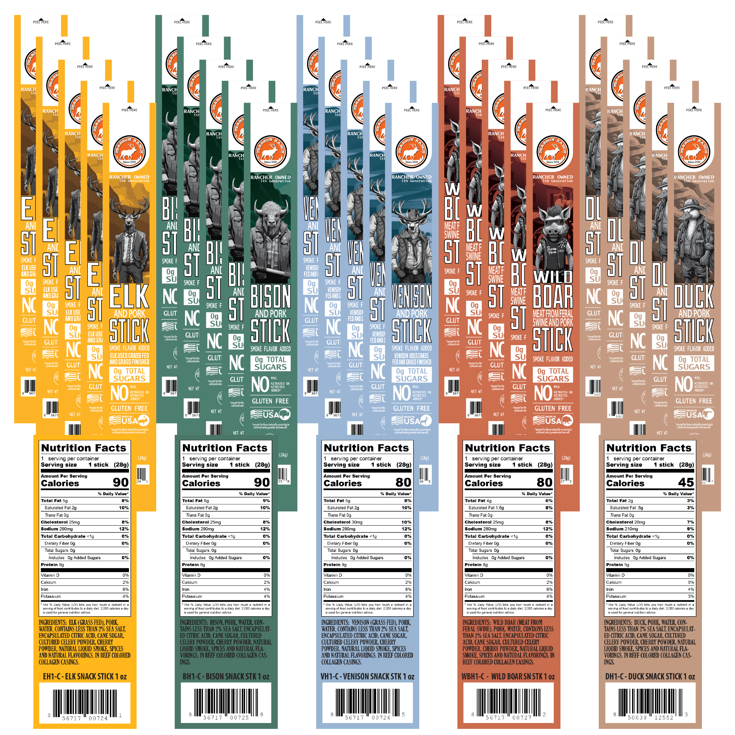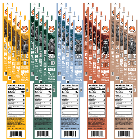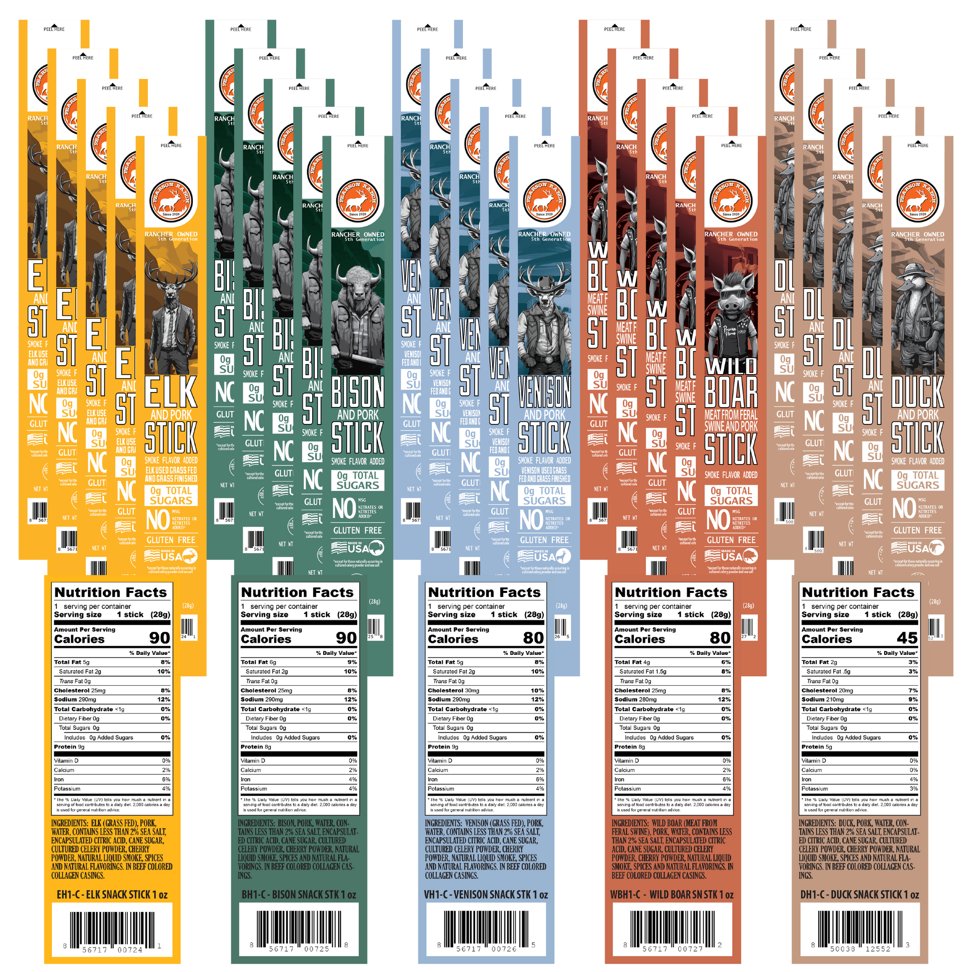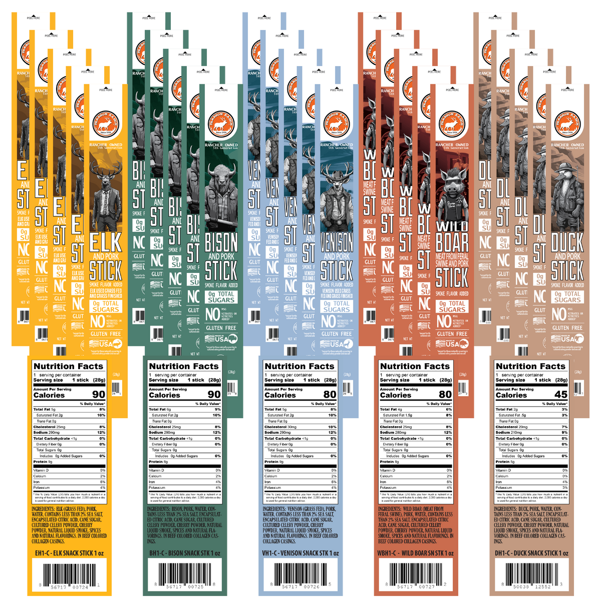 Twenty-five individually-wrapped snack sticks perfect for a day at the beach, on the golf course, hiking, or back packing. Five of each of our famously delicious elk, bison, venison, duck, and wild boar snack sticks.