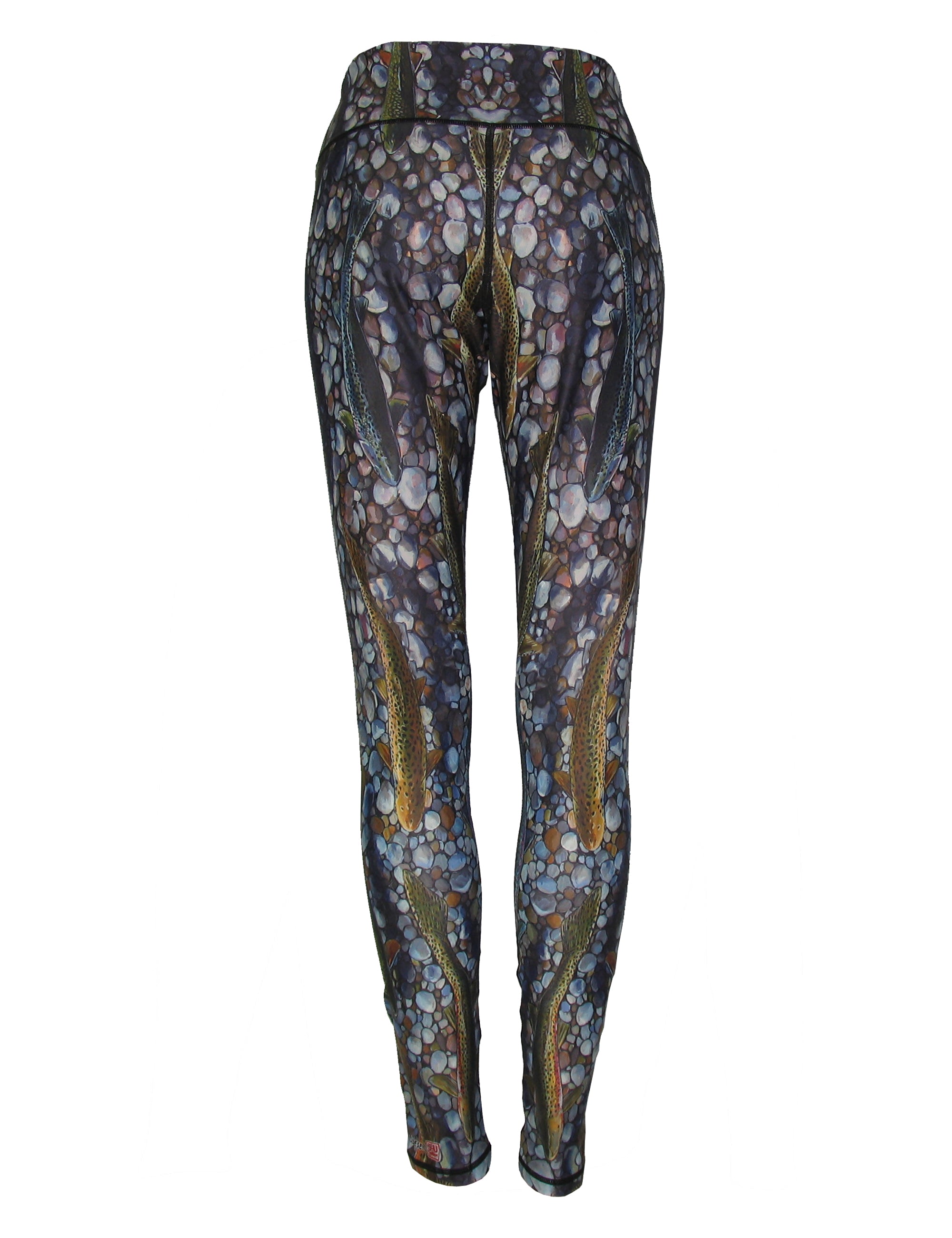 We feature Josh Udesen's Trout Dreams fish print pattern on a performance yoga-style legging. We make the best women's fly fishing clothing available. Wear as wader liners, long underwear, workout leggings, or to get trouty for a night on the town. Our fly fishing apparel works well as hiking clothes on the trail or as a base layer for active sports. Moisture wicking apparel with great sun protection.