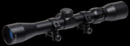 The truglo trushot scope has a duplex reticle, generous eye relief, fully-coated lenses for maximum brightness, clarity and contrast.It features rubber eye-guard removable lens caps, coin-style windage and elevation adjustment under screw down caps and durable leaf spring for windage and elevation adjustments, a 1" one piece tube made of aluminum with a durable, scratch-resistant, non-reflective matte finish.Includes 3/8" rings.
