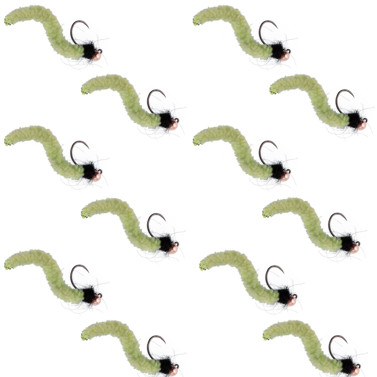 Tungsten Bead Chartreuse Wormy Mop Fly Tactical Jig Czech Euro Nymph Barbless Fly - 1 Dozen Flies Size 12