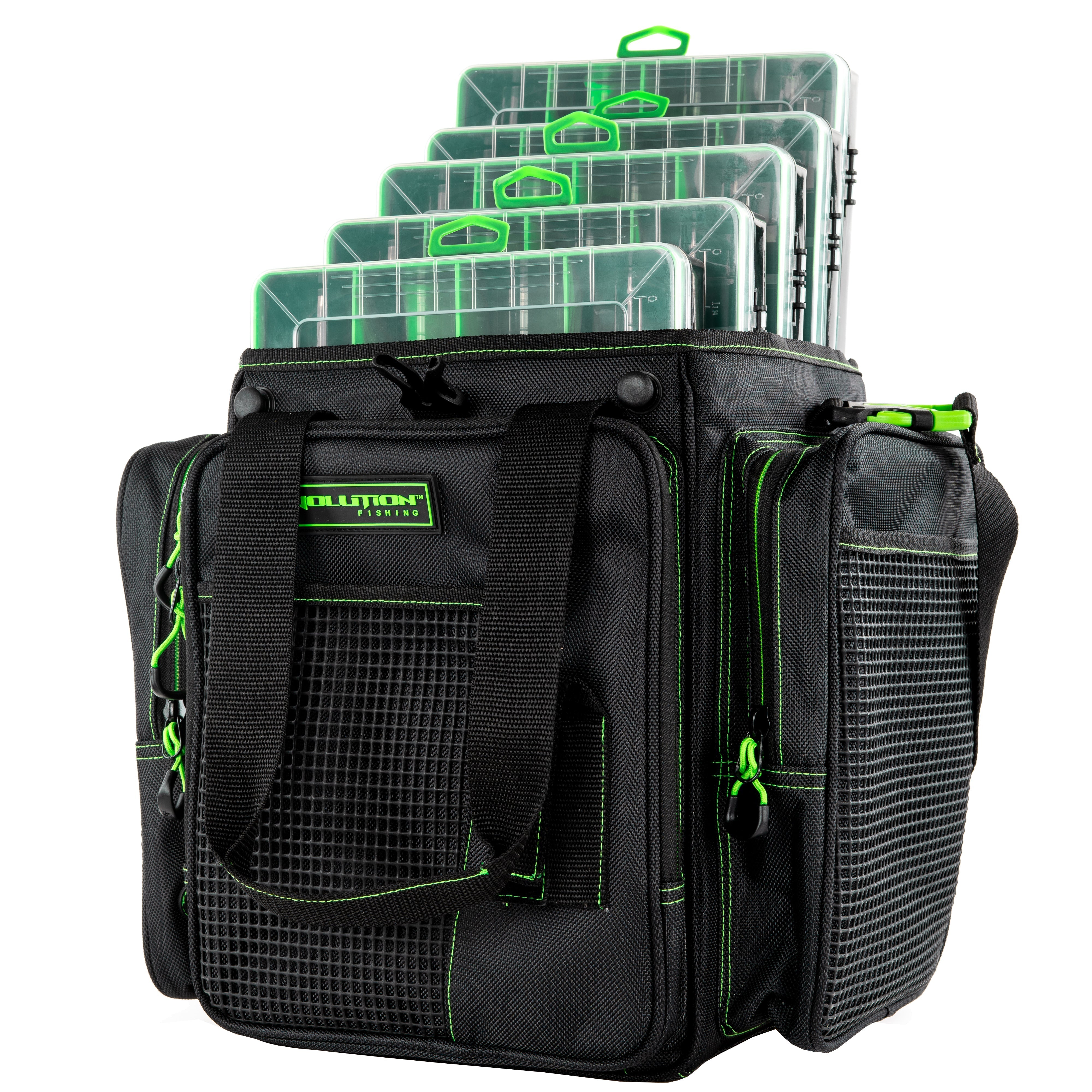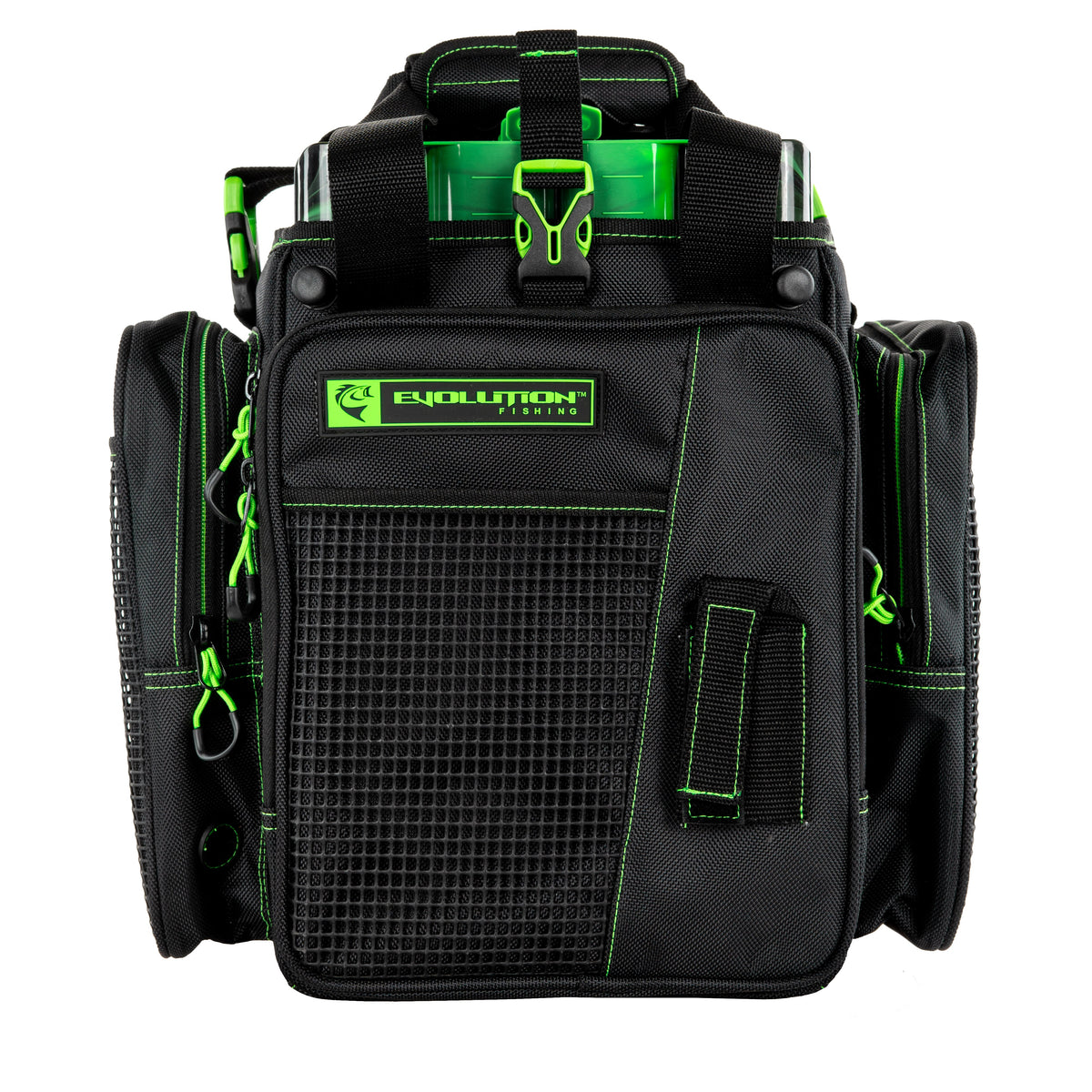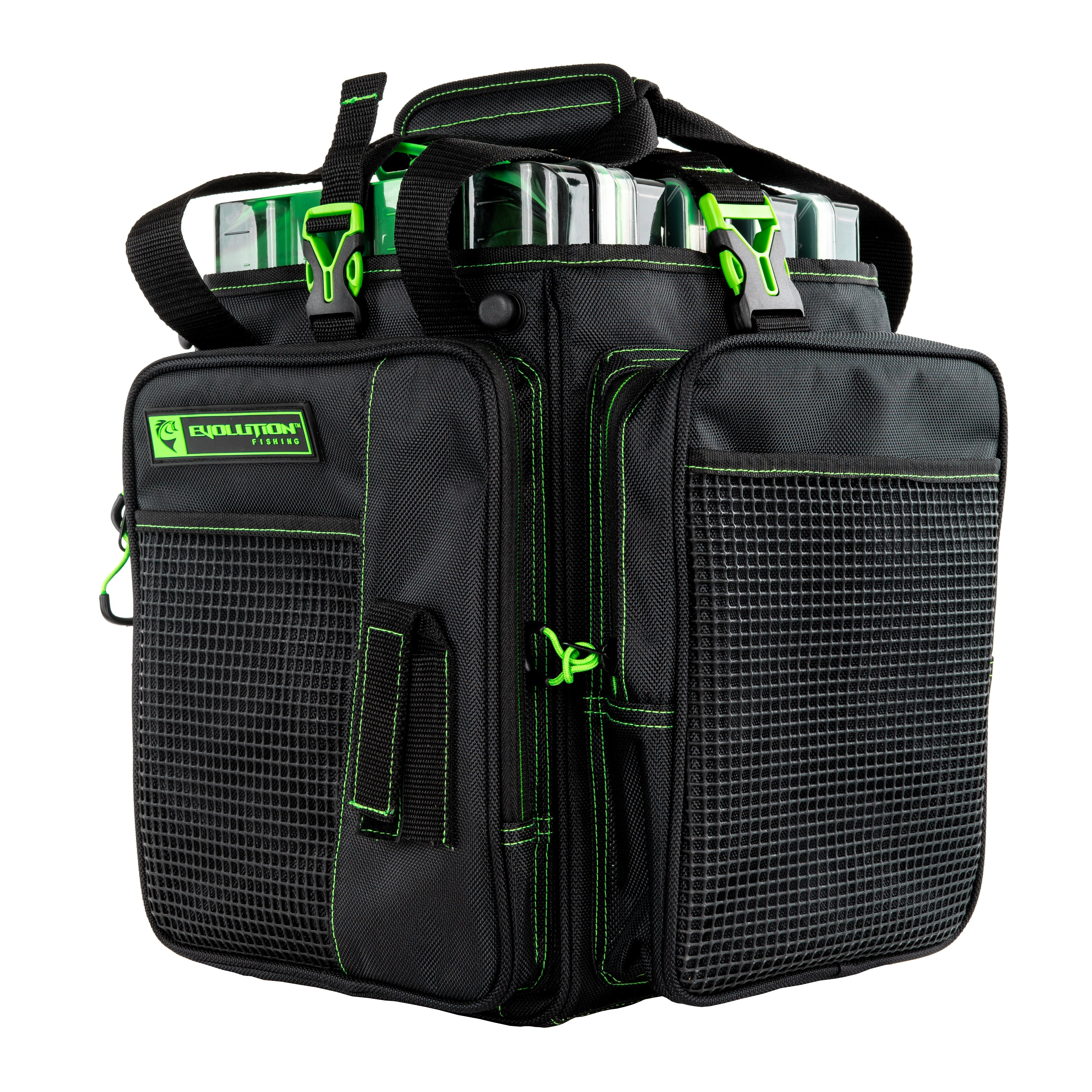 With its open top feature and extremely rugged wear-resistant 1680D construction, the Drift Series Topless Vertical Tackle Bags deliver the quality and functionality that Evolution Fishing is known for. These Drift Series Tackle Bags have an innovative large mouth, open top feature that provides quick and easy access to all your trays. Slide your trays in vertically with this version of the tackle bag. The integrated tie down Y-Strap will secure your trays in the bag, and in case of stormy weather, these bags are equipped with an integrated rain fly that you can zip up and store away when not in use. With 3 large exterior storage pockets and 4 rubber mesh slip pockets, you’ll have plenty of room to store all your accessories. It’s also equipped with a plier holster, side pocket line spool feed, and a non-slip, waterproof bottom with integrated drainage grommets. Transporting these tackle bags will be a breeze with the adjustable, removable shoulder strap and the padded top carry handle. With the capacity to hold up to 5 tackle trays, it’s more than capable of holding all your fishing essentials. Each tackle bag will include 5 matching color Drift Series Tackle Trays.