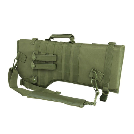 This tactical rifle scabbard is designed for the an easy, comfortable, and secure way of carrying a rifle/carbine over the shoulder or modular mounting onto molle compatible gear, with the rifle/carbine being readily accessible. This scabbard will fit most rifle/carbines with carry handle or scopes/optics attached to receiver rails. It also has a grommet for drainage.