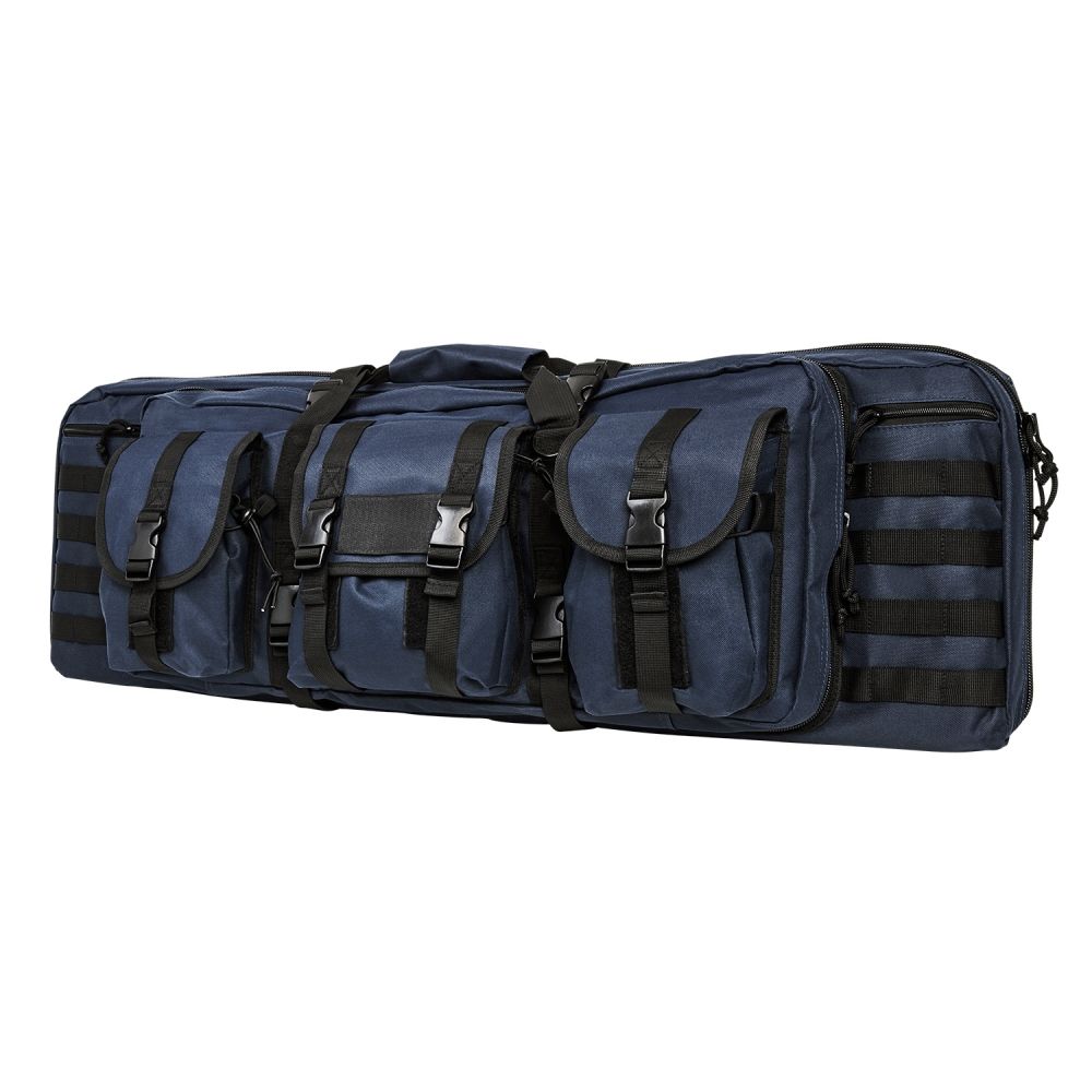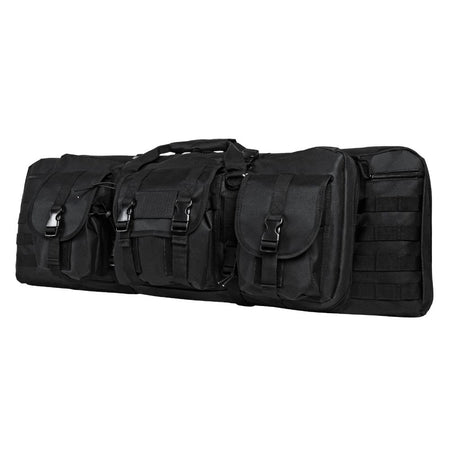 A deluxe carbine case that is fully padded for the safe transporting of 2 rifles and all of your other essential shooting gear. This deluxe case includes many different zippered compartments and pouches to keep your shooting gear organized and easy to get to. The 42double carbine case is constructed of heavy duty pvc material and the main compartment is fully padded on all side with thick 1/2" closed cell foam padding. The main compartment has heavy duty zippers with metal zipper pulls that can be locked with a small pad lock (lock not included). The main compartment will accommodate two rifles with an overall length of 36" or less. The deluxe carbine case has diagonal pockets on each end to help secure the stock and muzzle end of the rifle and a 2 hook and loop straps to secure each of the rifles. The secondary compartment is loaded with two zippered compartments and two padded compartments with hook and loop fasteners to store extra shooting gear. The three exterior pockets have flaps that close via hook and loop fasteners and plastic quick connect buckles to keep your gear secure. Each of the three pockets have bungee cording that can be adjusted to the size of your gear. The three exterior pockets are perfect for keeping your hearing and eye protection, magazines, magazine loaders and ammo organized.