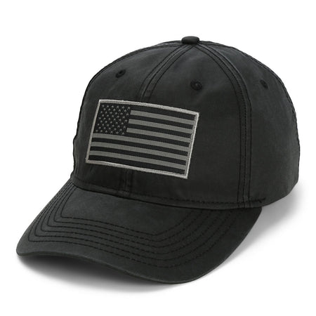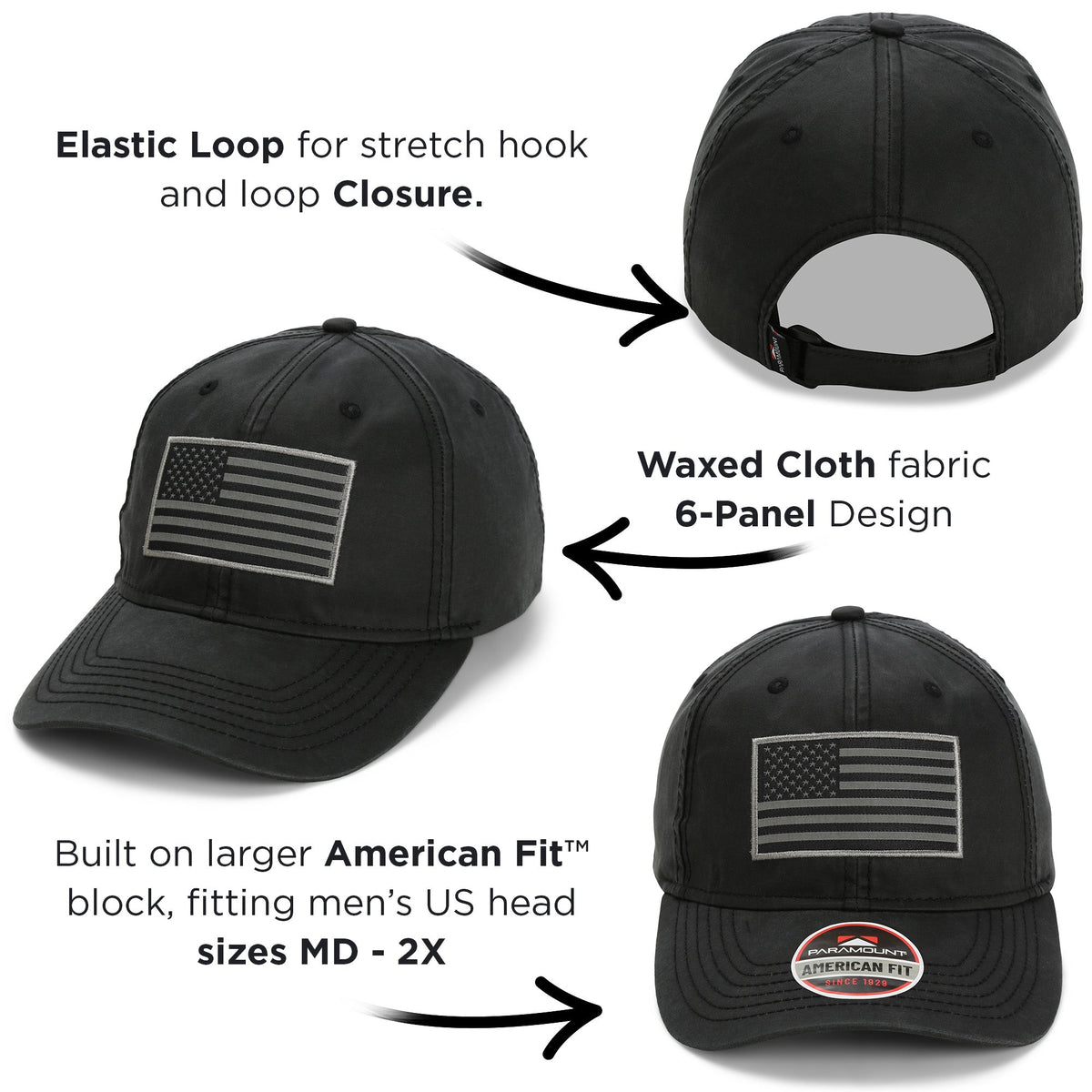 This Waxed Cloth American Flag cap is ready for the outdoors. Coupled with our American Fit design fitting US heads sizes MD - 2X, where our traditional caps only fit sizes SM - XL. American Fit was designed to fit a wider range of large head sizes for guys with big heads. Lastly, the hook and loop closer on this American flag cap features an elastic loop for a stretchable comfortable fit. Patriot Series