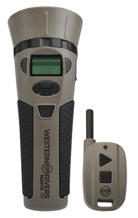The mantis 75 is a pre-loaded game call featuring a lcd screen readout with a back light.It has a durable rubberized grip and pivoting compact legs with lock-in position.The call also features random repeat times options, power button, back and setting buttons.The mantis 75 game call includs wolf, elk, deer, hog, turkey, bobcat, coyote, moose, rabbit, duck, fox and many more.Operates on 4 aaa batteries (not included).Included is a 300 ft remote control.