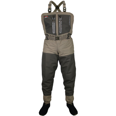 The Whetstone II is everything you are looking for in a quality fishing wader that is designed to last. This breathable stockingfoot wader takes the best features of some of our most popular designs and puts them together. Designed with our 6-Ply Nylon full wrap lower legs and a single seam crotch designed to eliminate seam chafe and cut down on leak opportunities. Additionally, the Whetstone II chest wader has ample storage with 7 total chest pockets including 2 highwater pockets, 2 zippered fly box pockets and lastly a flip out security device pocket. If that is not enough the suspenders of the Whetstone II offer 4 attachment points for quick access to essential fly fishing gear like nippers, hemostats, and tippet. Lastly, this fly fishing wader is complete with 4mm neoprene stockingfoot booties and attached 6-ply nylon gravel guards with lace hooks. If you are looking for quality at an affordable price point you can't go wrong with the Whetstone II.