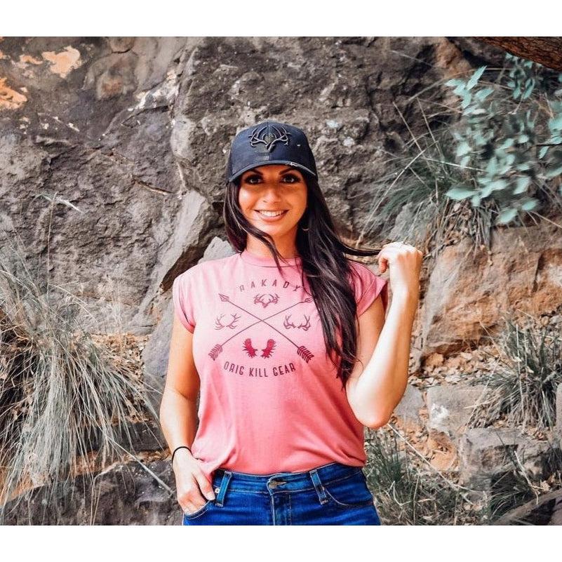 The Womens Crisscross Flowy Muscle Tee is on mauve colored material. It is form fitting and ultra comfortable. It is made out of combed ringspun cotton/polyester.