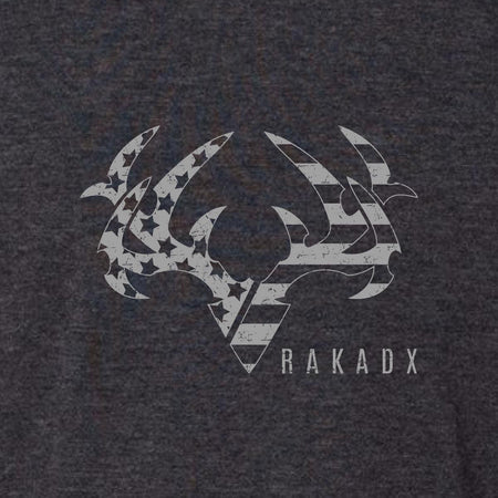The Womens Star Spangled Rak Long Sleeve is on a dark grey heather colored tee. It is form fitting and ultra comfortable. It is made out of combed ringspun cotton/polyester.