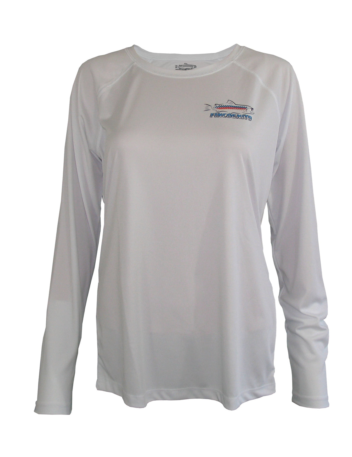 Lightweight sun protective SPF 50 fishing shirts with a raglan sleeve women's cut. We place Ed Anderson's "Tarpon Layup" on the back of this white-colored long sleeve T. The Fincognito logo adorns the left chest. 100% polyester with PURE-Tech wicking technology. Our fly fishing apparel works well on the water or as hiking clothes on the trail. Great sun protection, moisture wicking apparel.