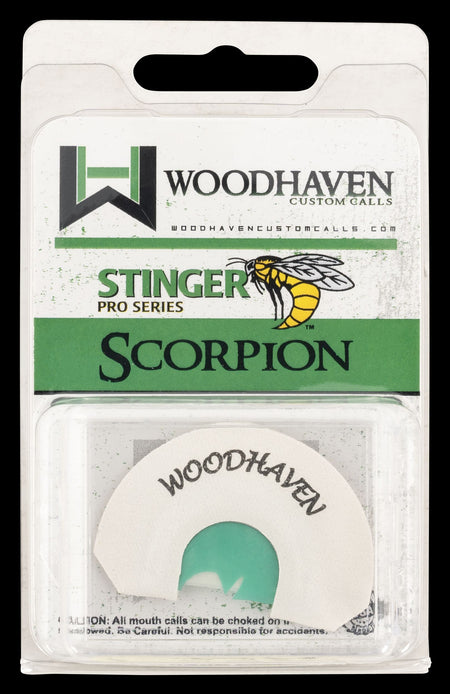 Woodhavens scorpion diaphragm call is a classic v-3 with a half-moon cut on one side.The scorpion is capable of higher tones & kee-kees, plus the raspiness of the v-3.