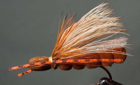 The Yellow Foam Golden Stonefly has a bullet head, yellow foam body covered by deer hair, rubber legs & hair wings. A great large fly for the Salmon Fly Hatch!